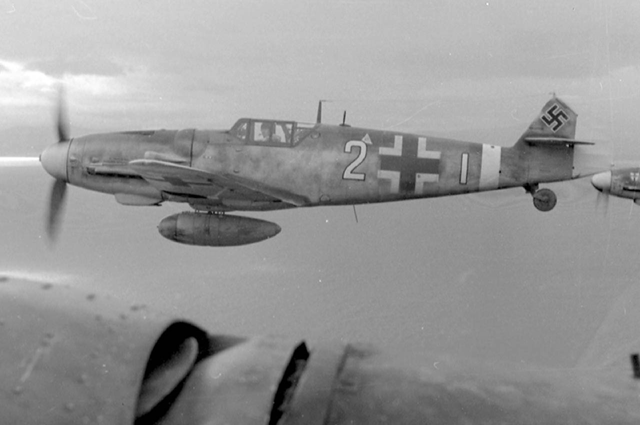メッサーシュミット Bf 109は、第二次世界大戦におけるナチスドイツ空軍の主力戦闘機。世界で初めて一撃離脱戦法を前提に開発されたとされ、機体重量に比し小さく薄い主翼を持ち、モーターカノンや主脚のエンジンマウントなど、特徴のある設計となっている。本機の生産数は30000機を超え、歴史上もっとも生産された戦闘機である。(ウィキペディアより)